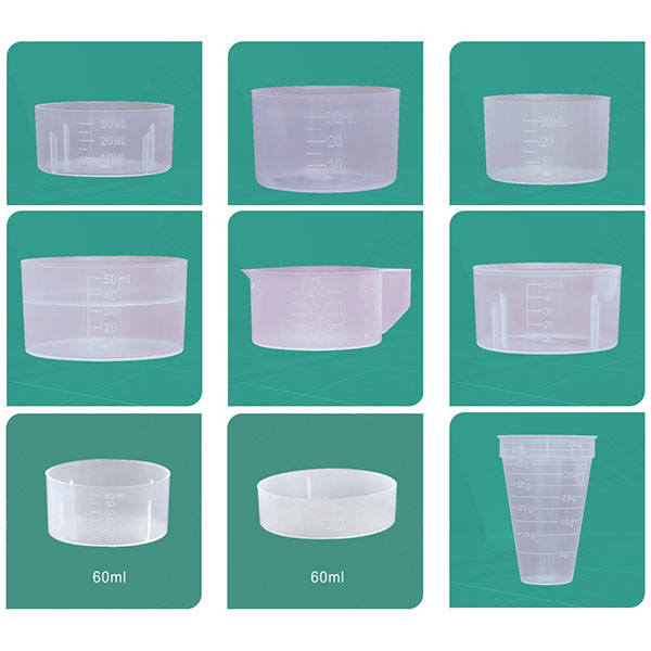 Een serie maatbekers die op maat zijn geproduceerd met behulp van blaasvormprocessen, geschikt voor gebruik in de keuken, industriële batching, laboratoria en het onderwijs.